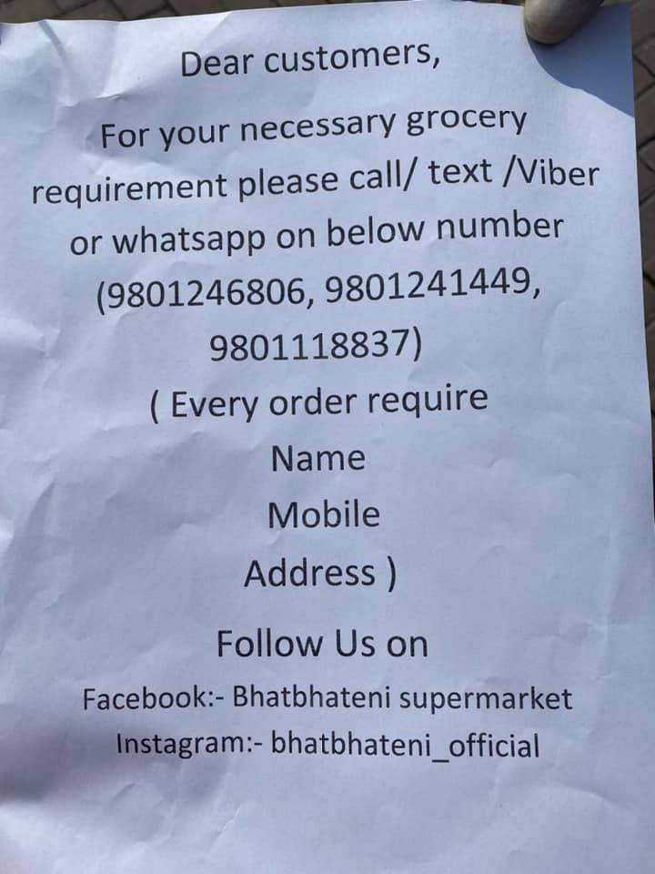 उपभोग्यवस्तु अभाव हुन नदिन उद्योग वाणिज्य तथा आपूर्ति मन्त्रालयले सबै ठूला सुप्परमार्केटलाई खुला राख्न तथा डेलीभरी सेवा थाल्न आग्रह गरेपछी भाटभटेनीले उक्त निर्णय गरेको हो । आफुलाई चाहिने समानको लागी भाटभटेनी सुपरमार्केटको फोन, भाईबर, ह्वाट्स्याप तथा फेसबुक मार्फत सम्पर्क गर्न सकिनेछ ।