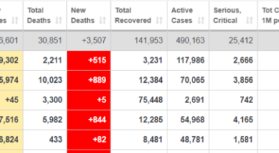 अमेरिकामा पछिल्लो एकैदिन १९ हजार ३०२ नयाँ संक्रमित फेला परेका छन् । त्यहाँ कोभिड कोरोना सं’क्रमणका कारण मृ’त्यु हुनेको संख्या २ हजार २११ पुगेको छ । पछिल्लो एकैदिनमा मात्र ५१५ जनाको मृत्यु भएको छ, जुन अमेरिकामा कोरोनाका कारण भएकै हालसम्मकै उच्च मृत्यु हो ।