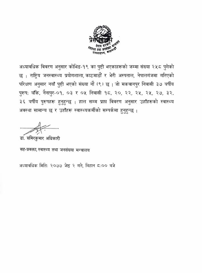 यो संगै नेपालमा संक्रमितको संख्या २ सय ५८ पुगेको छ ।