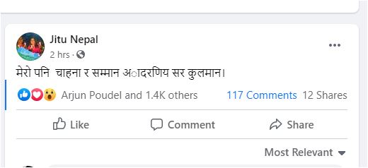 अर्का हास्य कलाकार जितु नेपाल लेख्नु हुन्छ – ‘मेरो पनि चाहना र सम्मान अादरणिय सर कुलमान।’