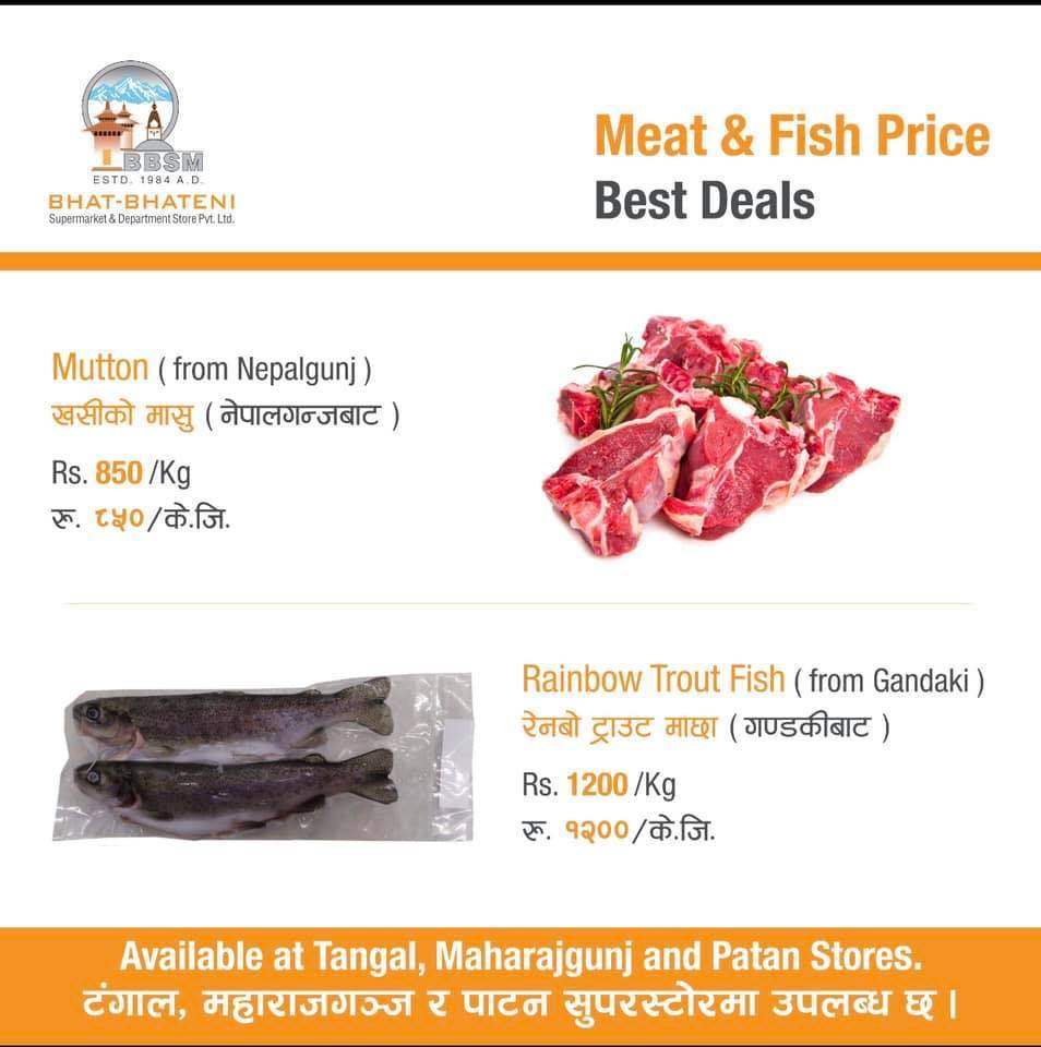 काठमाडौंको टंगाल, महाराजगञ्ज र ललितपुरको पाटनस्थित भाटभटेनी सुपरमार्केटबाट खसिको मासु प्रतिकेजी ८५० मा र रेम्बो ट्राउट माछा १२ सयमा बिक्री भइरहेको छ ।