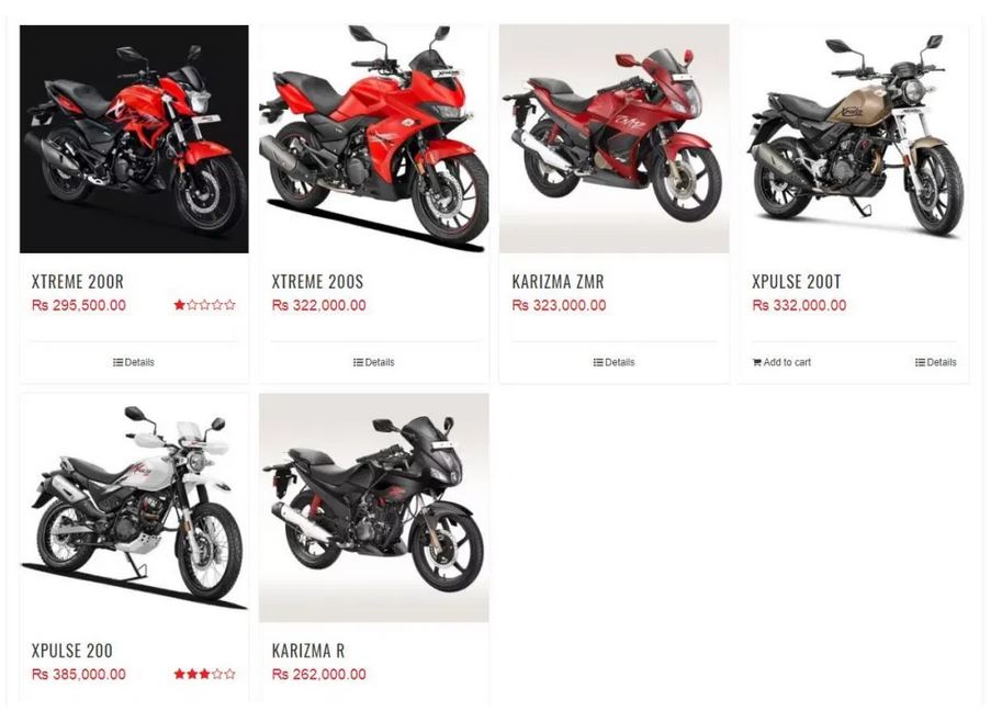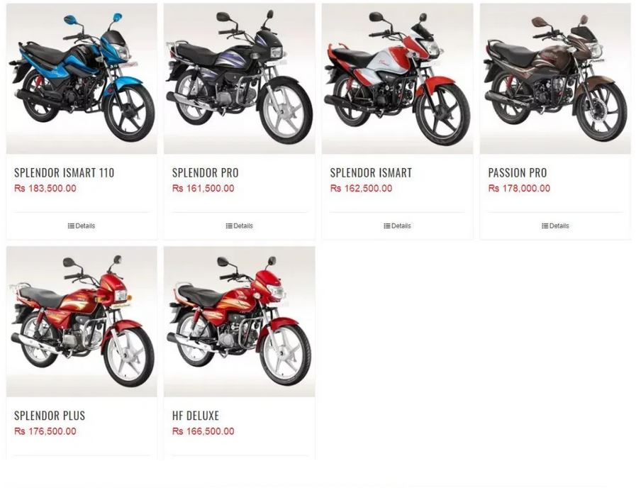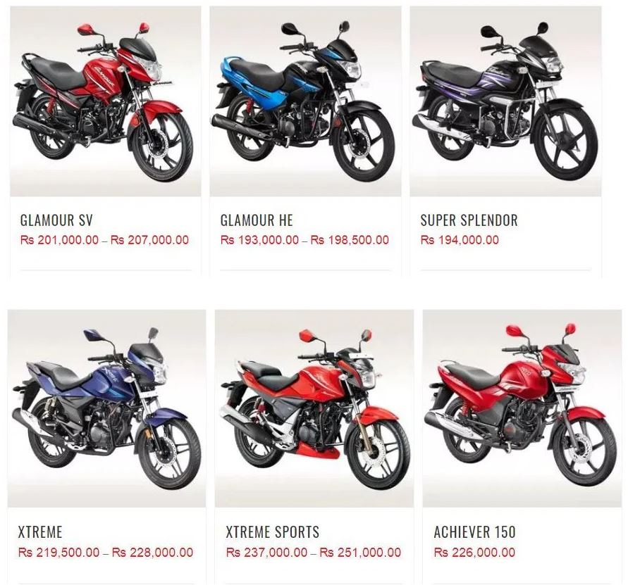 सबैभन्दा सस्तो भनिएको स्प्लेन्डर प्लस बाइकको मूल्य १ लाख ७६ हजार ५ सय रुपैयाँ देखि सबैभन्दा महंगो एक्सपल्स २०० मोटरसाइकलको मूल्य ३ लाख ८५ हजार रुपैयाँ रहेको छ । तल मोडल अनुसारको मूल्य हेर्नुहोस ।