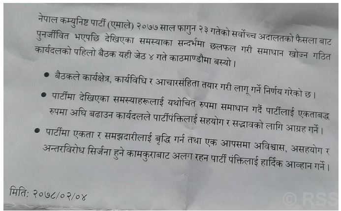 प्रधानमन्त्री तथा मन्त्रिपरिषद् कार्यालयमा आज बसेको कार्यदल बैठकले कुनै पनि असमझदारी र असहयोग बढ्ने कार्य नगर्न नेता तथा कार्यकर्तालाई आवहन गरेको हो । एमालेका प्रवक्ता एवं कार्यदलका सदस्य प्रदीपकुमार ज्ञवालीले कार्यदलले पार्टीले एकता र