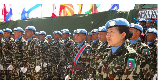 काठमाडौँ, १५ असार । संयुक्त राष्ट्रसङ्घको आह्वानमा विश्व शान्ति स्थापना कार्यमा धेरै सैनिक पठाउने मुलुकको सूचीमा नेपाल तेस्रो स्थानमा उक्लिएको छ । शान्ति सैनिक खटाएर योगदान पु¥याउने विश्वका मुलुकको सूचीमा नेपालको स्थान तेस्रो रहेको सैनिक प्रवक्ता सन्तोषबल्लभ पौडेलले जानकारी दिनुभयो । विश्वभरका द्वन्द्वरत मुलुकका १२ शान्ति मिसनमा पाँच हजार १५४ सङ्ख्यामा अहिले नेपाली शान्ति सैनिक परिचालित छन् । विश्वका १२२ राष्ट्रले राष्ट्रसङ्घको आह्वानमा शान्ति सैनिक खटाउँदै आएका छन् । अफ्रिका महादेशका द्वन्द्वरत मुलुक सुडान र कङगोलगायतमा अहिले शान्ति सैनिकका रूपमा कार्यरत नेपाली महिला सैनिकको सङ्ख्या १७६ रहेको छ । यसअघि एक हजार ५५० नेपाली महिला सैनिकबाट शान्ति कार्यमा योगदान भइसकेको छ ।