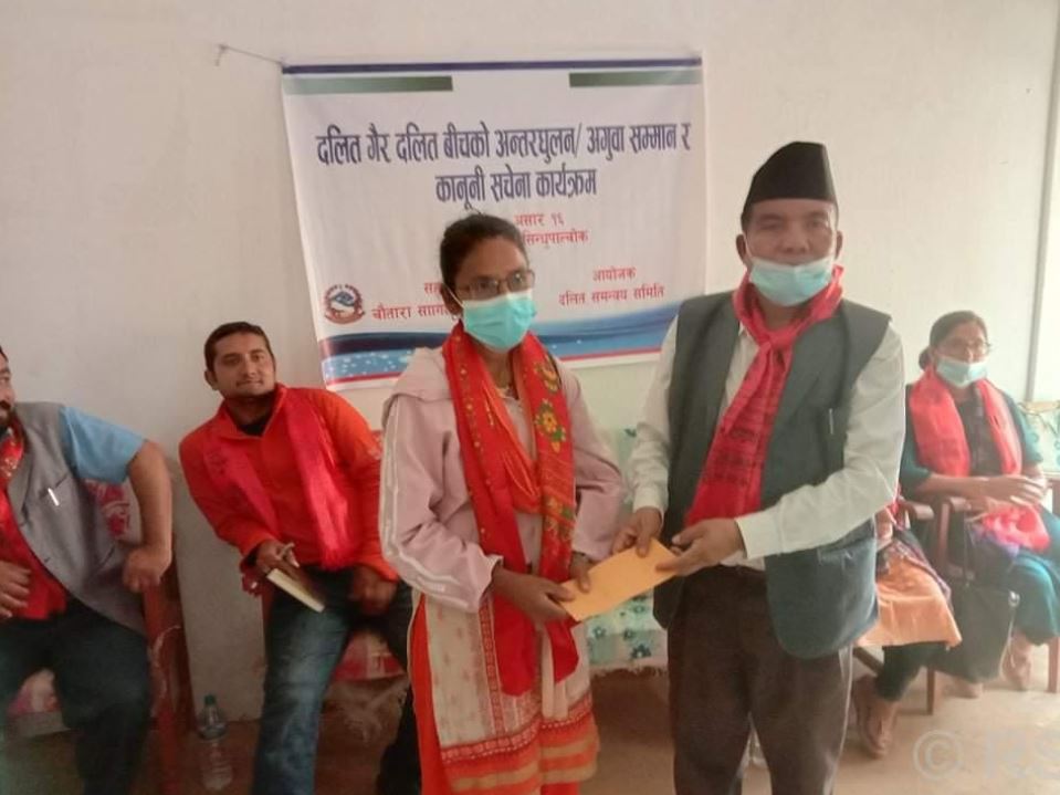 सिन्धुपाल्चोकको चौतारा–साँगाचोकगढी नगरपालिकाले अन्तरजातीय विवाह गर्ने दुई जोडीलाई नगदसहित सम्मान गरेको छ । अन्तरजातीय विवाह गरेका चौतारा साँगाचोकगढी नगरपालिका–९ का युनिक विक पोखरेल र राधिका गिरी, वडा नं. ५ का कृष्ण विक र शर्मिला नेपालीलाई नगद पाँच÷पाँच हजारसहित नगरप्रमुख अमानसिं तामाङले सम्मान गर्नुभएको हो । नगरस्तरीय दलित समन्वय समितिको आयोजनामा भएको कार्यक्रममा दलित समुदायबाट शहिद हुने गोरेबहादुर पुर्कोटी, मोहन विक र निरबहादुर विकको परिवारलाई पनि पाँच÷पाँच हजारसहित सम्मान गरिएको थियो ।