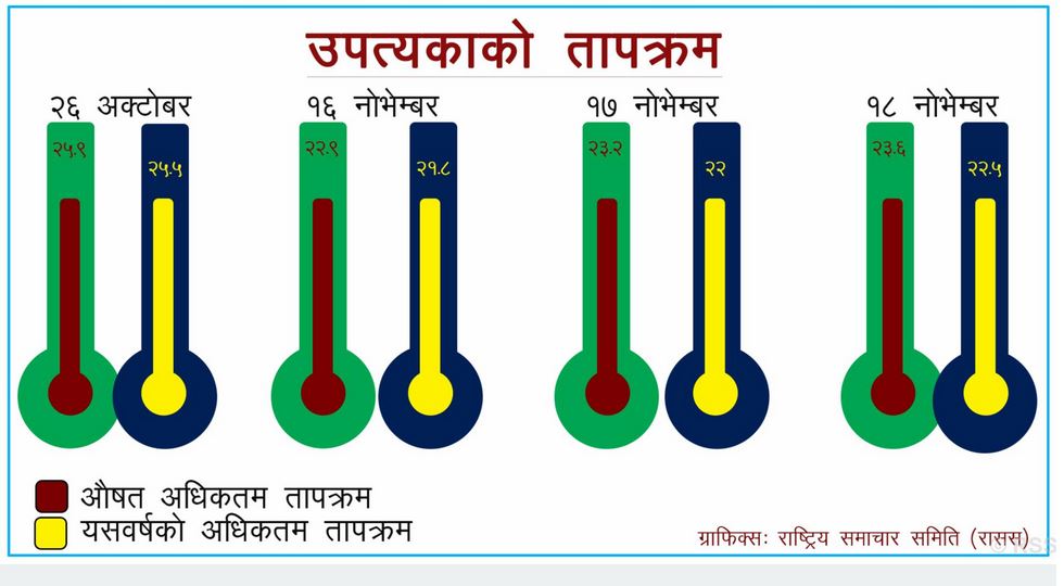 दुई दिन नोभेम्बर १७ (बुधबार) काठमाडौँ उपत्यकाको अधिकतम तापक्रम (३० वर्षको औषत तापक्रम २३.२ डिग्री) हो । यसपालिको अधिकतम तापक्रम घटेर २२ डिग्रीमा झरेको छ । अघिल्लो वर्ष सोही दिन २२ दशमलव ६ डिग्री थियो । त्यसको अघिल्लो दिन नोभेम्बर १६ (मङ्गलबार) औषत अधिकतम तापक्रम २२ दशमलव ९ हो । त्यसदिन तापक्रम २१ दशमलव ८ डिग्रीमा झरेको जल तथा मौसम विज्ञान विभागले जनाएको छ । हिजो बिहीबार औषत तापक्रम २३ दशमलव ६ हो तर तापक्रम घटेर २२ दशमलव ५ मा आएको थियो ।