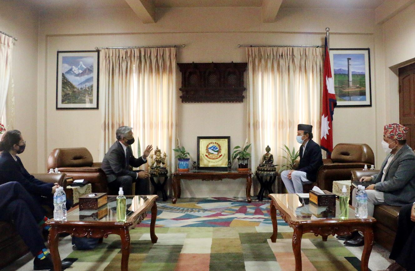 परराष्ट्रमन्त्री डा नारायण खड्कासँग दक्षिण तथा मध्य एशियाली मामिलासम्बन्धी अमेरिकी सहायक विदेशमन्त्री डोनाल्ड लु र उपसहायक विदेशमन्त्री केली किडरलिङले शिष्टाचार भेट गर्नुभयो । त्यस अवसरमा नेपाल–अमेरिका मैत्री र सहयोगका बृहत् क्षेत्रमा छलफल हुनाका साथै नेपालको विकास प्राथमिकताका विभिन्न विषयसहित महामारीपछिको आर्थिक पुनरुत्थानमा व्यापार र लगानीको भूमिका महत्वपूर्ण हुनेमा उहाँहरूबीच छलफल भएको थियो ।
